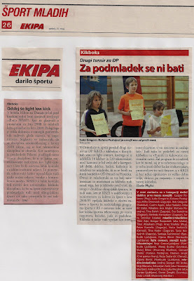 ..članek v Ekipi dne 08.05.2009 v prilogi "Šport mladih" o rezultatih otrok,kadetov in mladincev na zadnjem državnem prvenstvu KBZS v semi in light contactu, ki je bil 04.04.2009 v Ormožu. Luka Gregorn je prvič zmagal celo dve borbi in osvojil 1.mesto v kategoriji dečki do 10 let do 145cm. Na spodnji sliki lahko vidite predstavitev Katane meseca septembra v Postojni na Mini olimpijadi, kjer otroci poskušajo opremo in Luka je bil z njimi. Tako se je prvič spoznal naš klub in kickboxing, ter orožja, ki jih uporabljamo. Luka trenira šele 9 mesecev in ima rumen pas, ter možnost osvoijti naslov državnega prvaka KBZS v svoji kategoriji,na zadnji tekmi finala državnega prvenstva KBZS, ki bo naslednji vikend v Ptuju, saj je bil prvi turnir tretji in na drugem prvi. Kakorkoli tudi ,če mu ne uspe je to izjemen dosežek tako zanj kot za klub in mene kot trenerja.